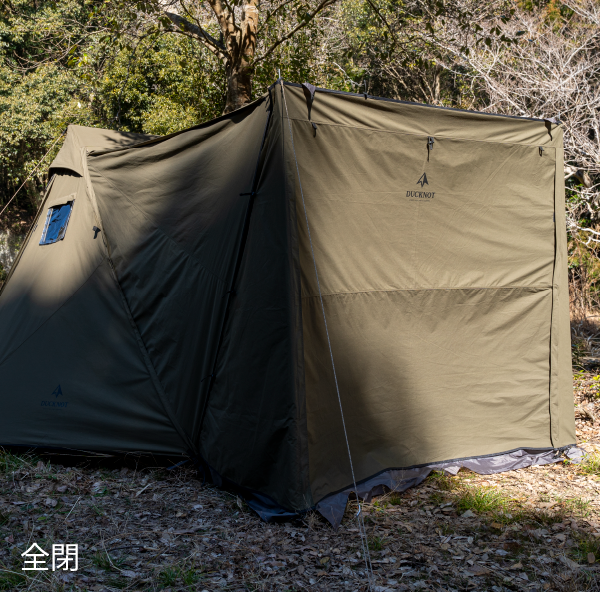 前幕のSW(シェルターウォール)は、フロント部分を開放したり、全閉にしたり、シチュエーションによってアレンジができます。側面だけを広げれば、キャンプ場だけでなく、おうちキャンプでも隣家や道路からの視線も気にせずに楽しむことができます。