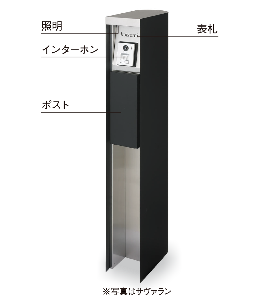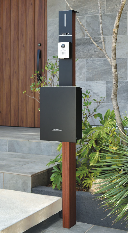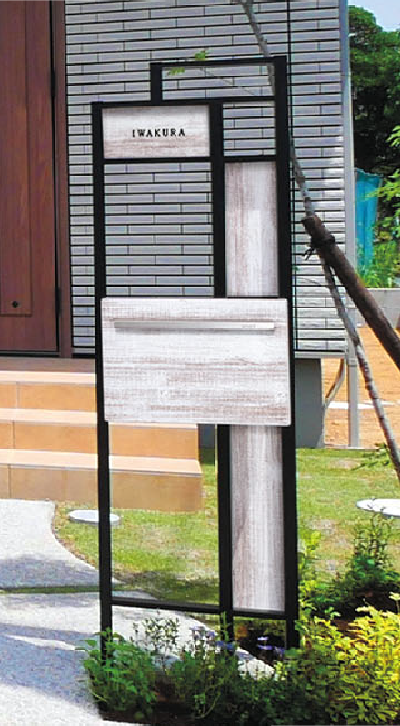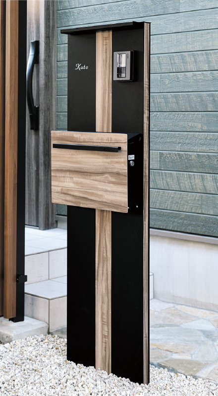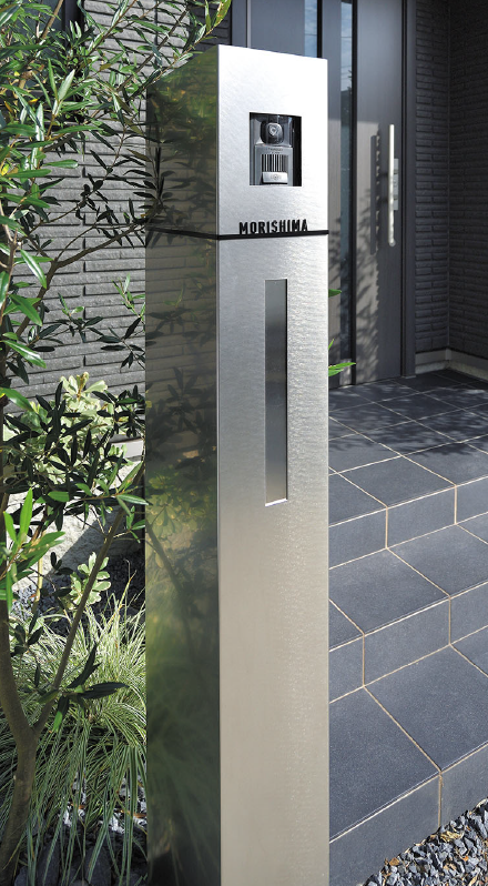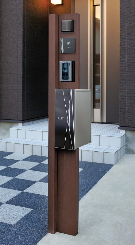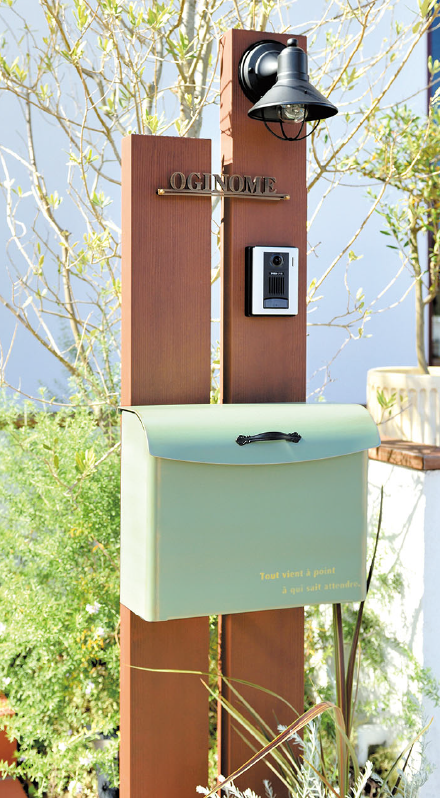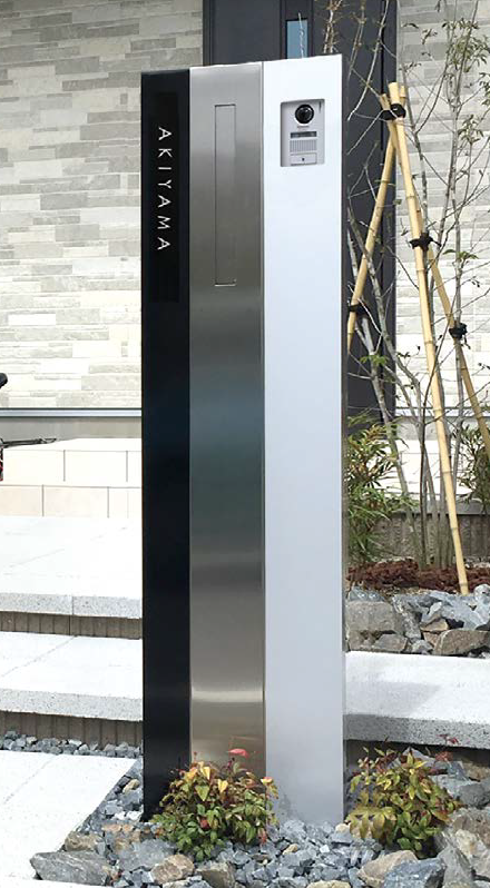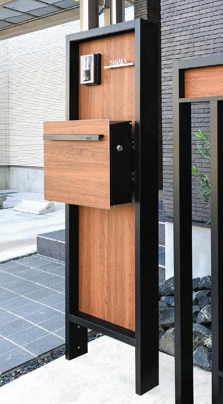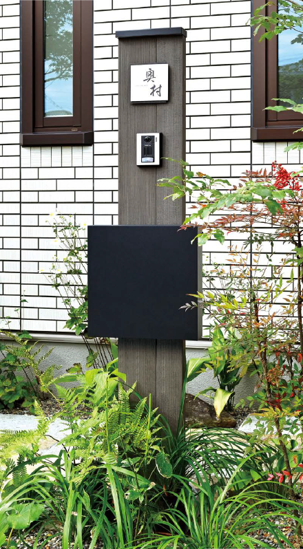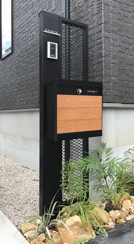 ポストをスッキリと納めた適度なワイドサイズの機能門柱。重厚感もあり、ファサードのフォーカルポイントに。