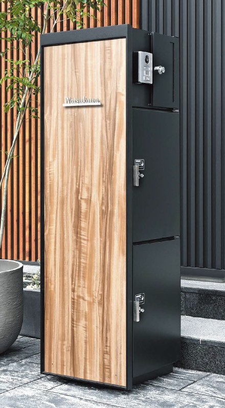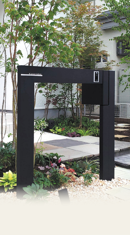 いまや必須アイテムとなりつつある、宅配ボックスの付いた機能門柱。スッキリと宅配ボックスを設置できるのが魅力ですね。