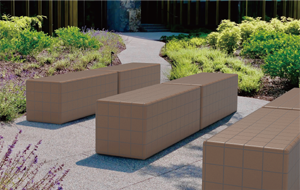 広い空間でも存在感が目を引くパブリックアートのようなセラミックタイルの屋外ベンチ。単独でも、並べても、うまく空間に納まります。