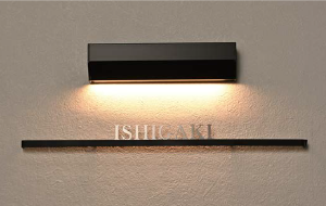 モダンな陰影が印象的な「オンブルゲート1型」。サイズオーダー対応のゲートで、専用のスポットライトやポストの取り付けも可能です。