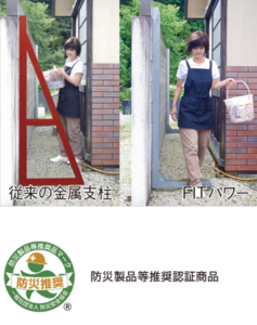 ブロック塀を守るのではなく、人の命を守る耐震補強金具「FIT パワー」。震災時にCB塀が急に倒れてくるのを防ぎ人命を守る装置です。都市部住宅密集地のような狭小地のCB塀の耐震化に適する製品・工法です。