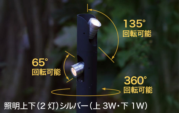 光の角度や方向をマルチに調整できるポールタイプのスポットライト。上方照明は樹木や壁面、下方照明は花壇や通路を照らすなど、シーンに合わせて演出できます。