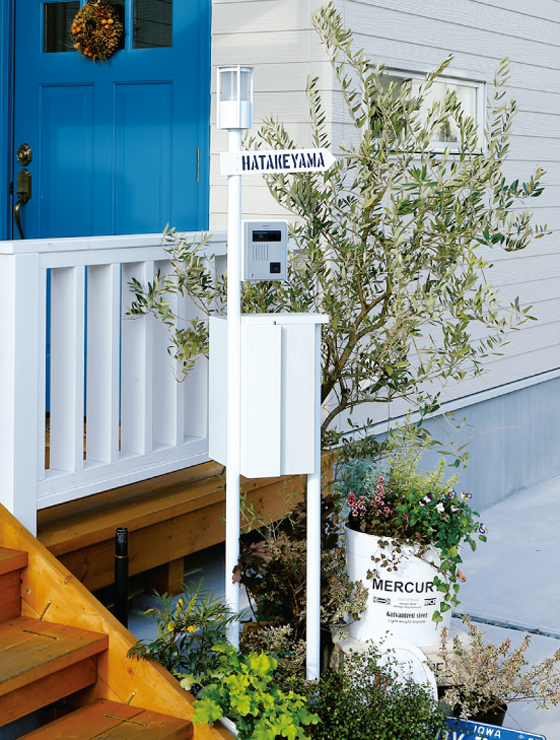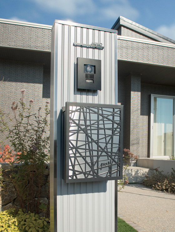 ファサードシーンにアクセントを添えるネームプレートと木調パネルを基調としたデザインの機能門柱。
