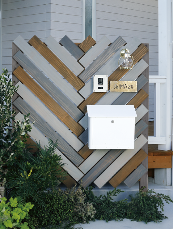 空間に動きを与えつつ上品にまとめる天然木のヘリンボーンウォール。門塀やフェンスとして高低差をつけて配置すると爽やかで締りのある印象の空間に仕上がります。