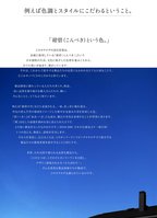 例えば色調とスタイルにこだわるということ。「紺碧(こんぺき)という色。」このカタログの設計思想は、表紙に使用している「紺碧(こんぺき)」という日本独特の生活、文化に根ざした色彩を選ぶことから、全ての想いが始まり、繋がっています。それは、これからご紹介する製品たちの品質にもかかわるとても大切なことで、どこかモノづくりのこだわりと似ています。製品開発に携わっている人たちの多くの、熱意。高い品質を創り続ける職人さんたちの、願い。そんなことと、とてもよく似ています。例えば「紺碧の空」などと表現される、一面、真っ青に晴れ渡る、空気の澄んだ空の様相をイメージした鮮やかな深みの青を形容した色。「碧(へき)」は「あお・へき」とも読み、盤石の青色を表現することが背景にあります。「紺」はむしろ語感を強める為に添えられたようで、より深い紺色を言ったものなのです。(※DIC888 日本の伝統色より一部引用)1つの色にも、物語と、意味が存在します。それらを発見し、伝えることは、このオンリーワンリビングカタログでご紹介する製品たちの開発思想を紹介することと同じです。世界、日本全国で創られる良質な製品たち。1つひとつが、こだわりとオンリーワンを目指し、デザイン開発されたモノたちばかり…。そんな貴重な製品情報たちの物語で、このカタログは創られているのです。