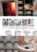 磁土をかくはん機に割り入れ、水で薄めた珪酸ソーダを加え、不要物を取り除きながらドロドロの状態になるまでかき混ぜる。でき上がった泥(でい)しょうを、圧力タンクを通じて手洗鉢の石膏型に流し入れる。圧力をかけて一気に流し込むという成型方法のため、複雑な造形も美しく仕上げることができる。石膏型をそのままの状態で約1~2時間放置。石膏に泥(でい)しょうの水分を吸い込ませることで、しっかりとした素地ができあがる。素地と石膏型のすき間にエアガンで空気を送り込み、型から素地を外す。できあがった素地は、30℃程度の室温や天日のもとで5~6日かけて自然乾燥。ある程度水分が抜けたところで、型の合わせ目などにできた余分な“バリ”を削り取り、約80℃の乾燥室で一晩かけて強制乾燥。乾燥させた素地に、絵付け(染料の付いたシートに水を含ませ、素地に模様をうつす)を行い、その上から釉薬を掛ける。1200~1300℃の丸窯に入れ、ほぼ一昼夜かけて焼成する。泥(でい)しょうを作る石膏型で成型する1石膏型で成型する2素地を乾燥させる絵付け・焼成する053
