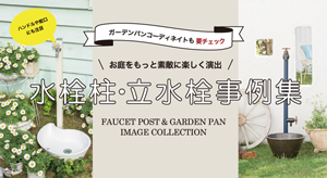 2018.7.19 その他 水栓柱・立水栓事例集を更新しました。 オンリーワンガーデンカタログ掲載の人気の水栓柱・立水栓のお洒落な事例集を更新しました。ガーデパンやハンドル、蛇口などお庭がもっと楽しくなる素敵なコーディネイトも要チェックです。 画像をクリックすると別ページに移動します。