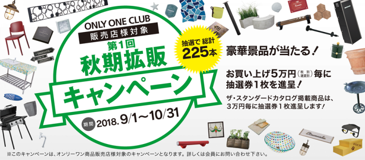 2018.8.6 その他 2018年9月1日〜10月31日よりオンリーワンクラブ販売店様対象 の秋季拡販キャンペーンを行います。 2018年9月1日〜10月31日よりオンリーワンクラブ販売店様対象の秋季拡販キャンペーンを行います。お買い上げ5万円毎に豪華商品が当たる抽選券1枚を進呈!2018年12月4日に抽選会を行い、後日ホームページにて発表いたします。 画像をクリックするとpdfが表示されます。