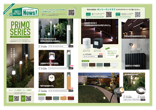 2020.9.18 オンリーワン NEWS 「オンリーワンNEWS Vol.11」を発行致します。 「オンリーワンNEWS Vol.11」を発行致しました。第11弾は、「ガーデンライト プリモシリーズ」の特集です。(印刷の際は、A3サイズの両面(短辺綴じ)印刷をお勧めします。) 画像をクリックするとpdfデータが表示されます。