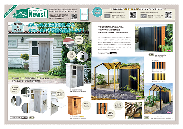 2020.10.19 オンリーワン NEWS 「オンリーワンNEWS Vol.13」を発行致します。 「オンリーワンNEWS Vol.13」を発行致しました。第13弾は、「おしゃれにお庭を楽しめるミニハウスや物置」の特集です。(印刷の際は、A3サイズの両面(短辺綴じ)印刷をお勧めします。) 画像をクリックするとpdfデータが表示されます。