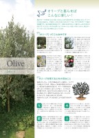 Oliveオリーブ100P01生長が早いオリーブは、挿し木をして1年で30~40cm、翌年にはその倍の高さへと生長します。とくに地植えの場合はぐんぐんと枝葉を伸ばし、成木は10mにもなります。樹齢がとても長く、地中海沿岸地域では1,000年を超える老木がいまだに果実を実らせています。5月中旬から6月上旬頃に、直径5mmほどの小さくてミルク色をしたかわいい花を、ひと房に10~30輪ほど咲かせます。その様子は同じモクセイ科のキンモクセイとよく似ています。結実するのはおよそ1割程度。自家受粉しにくい植物のため、違う品種を2本以上植えるとより確実に実をつけます。葉の表面は光沢のある緑色、裏面には白い細毛が密生しています。しなやかな枝は対生に葉をつけて茂り、風が吹くと揺れながらきらきらと銀灰色に輝きます。オリーブの葉にはポリフェノールや鉄分、カルシウムなどが豊富に含まれ、オリーブの葉を使った健康茶も親しまれています。受粉1週間後から結実し始め、秋が深まるにつれて実が除々にふくらんでいきます。色もグリーンから赤、紫、黒へと成熟。そのままかじるととても渋いのですが、塩で漬けるとオリーブは滋味深い味わいに。エクストラバージンオリーブオイルは、熟した果実を搾ってとれた黄金色の純度100%の果汁です。オリーブと暮らせばこんなに楽しい!鳩がオリーブの枝をくわえて帰ってきたことから洪水が引いたのを知ったという『ノアの方舟』の話から、平和のシンボルとされてきたオリーブは、モクセイ科オリーブ属の常緑樹です。地中海地方原産なので、太陽と水はけのよい土壌とたっぷりの水が大好きです。丈夫さとつややかな葉、丸くてかわいらしい実をつけることから、最近ガーデンでもっとも人気の樹木になっています。地植えだったら、日当りや風通しがいい場所に。コンテナや鉢植えにすれば、季節よって最適な環境におけるので、寒冷地でも栽培が可能です。オリーブは特別な世話をしなくても枯れてしまうことのない、とても丈夫な果樹ですが、幼木のうちから支柱を立てたり、適度に剪定したり、肥料やりも忘れないなど、少し手をかけることで、見違えるほどよく育ちます。世話をすることが、早く実を見ることの近道でもあるのです。「オリーブ」ってこんな木ですオリーブを育てるとき大切なこと木花葉実日当たりのよい場所に植えるのがおすすめです。また、つねに枝の奥まで光が当たり、風通しをよくするように枝を剪定しておくと、枝葉がいきいきと育ちます。元気な木には、病気や虫もつきにくくなります。光肥料は、花芽が動き出す3月、実が充実する6月、実を収穫したお礼肥えの10月の、年3回与える(3月は規定量より少し多め、6月・10月は規定量の半分)のが基本的です。肥料は有機肥料の場合も化成肥料の場合も、窒素(N)、リン酸(P)、力リ(K)が等配合になったものが使いやすいでしょう。肥水はけのよい土に植えて、水を切らさないように注意します。地植えの場合、しっかり根づいてからは定期的な水やりの必要はありませんが、鉢植え、コンテナ栽培の場合は1年を通して土が乾いたらたっぷり水を与えます。水オリーブは過湿に弱いため、水はけのよい土に植えることが大切です。鉢植えの場合は、排水性と通気性をよくするために鉢底石を入れてから、培養土に排水性を高める小粒の日向土や赤玉の小粒をミックスしたり、アルカリ性を高め、微生物が増えるようにくん炭を混ぜるのがおすすめです。土