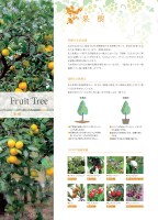 ●ジューンベリー●フェイジョア●ユスラウメ●ブラックベリー●ヒメイチゴノキ●ブルーベリー●ビワ●ブドウ・デラウェア▶ P.119▶ P.69▶ P.119▶ P.72▶ P.72▶ P.72▶ P.33、53、55、151▶ P.31、72、122、162Fruit Treeおおむね2年以上栽培する草本植物及び木本植物であって、果実を食用とするものを『果樹』と称しています。(農林水産省)また果樹という呼び方が馴染まない場合においては、『果物(くだもの)』や『果実』と記載していることがあります。ちなみにメロン、イチゴ、スイカなど1年生草本植物は野菜の類に入ります。日本国内では今130種の果樹が栽培されていますが、一般的に育てやすい柑橘類(ミカン属)果樹が多いようです。住宅事情や家族環境から、昨今は「鉢植え栽培」が「地植え栽培」に近づく勢いで比率を増やしています。栽培方法のメリットはそれぞれ違いますが楽しみは一緒です。地植えと鉢植え果樹のまめ知識カタログ掲載果樹●ご家族の成長と共にシンボルツリーとしても楽しめます。●収穫の多さから様々なジャムや果実酒、ドライフルーツなどが作れます。●水やりなど意外に手がかからない。●スペースが限られていたり、ベランダでも容易にできる。●剪定などが容易にでき、収穫も楽にできる。●移動ができるので環境が選べる。地植え鉢植え果 樹果か 樹じゅ104P01