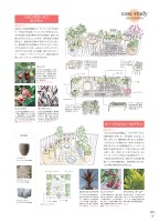 13P01使用商材コルディリネ・インディビサジューンベリーゲッケイジュ・オーレアトリコ9R-12[ガーデンリビングカタログ掲載]スヴェリエ ストーン[マテリアルカタログ掲載]オリーブモクセイ科の常緑高木。実がピクルスやオイル漬けにできるだけでなく、表が緑、裏がシルバーの葉は、風がふくときらきらと光るように見えてとても魅力的。▶P.34,37,53,103,160ベランダガーデンのプランルーフバルコニーのプラン作業用のデスクがあると植え替え作業などを床面で行うよりぐっとらくな姿勢でできる。アンティークな長い机は苗の置き場に最適。日当たりのいちばんよい場所に置いて。フランスのアンティークなヴォレー(鎧戸)を背景にするとブロカントな雰囲気たっぷりに。アンティークなテーブルの上にお気に入りのガーデン雑貨を飾って。フェイジョアフトモモ科の常緑低木。オリーブ同様、葉裏がシルバーで美しく、樹姿が美しいことから最近では生け垣などの利用にも人気。トロピカルな花と実も楽しめる。 ▶P.33,53,55,151ホップブッシュムクロジ科の常緑低木。夏は緑の葉色が寒さにあたると真っ赤に変わり、真冬にはシックなチョコレート色に。葉色の変化が1年中楽しめる魅力的なカラーリーフ。 ▶P.44,130リュウゼツラン科の常緑中木。放射状に葉が広がる姿が美しく、葉色のシックな赤紫がしゃれた印象。成長が遅く、手間をかけずに美しい樹姿がキープできる。 ▶P.45,132バラ科の落葉中木で、春には清楚な白い花が咲き、初夏には真っ赤な実がなり、秋には紅葉が楽しめる、と見所が満載。枝が細めで繊細な印象なのも人気の理由。 ▶P.31,72,122,162料理にも使え、1本あると便利なクスノキ科の常緑高木。‘オーレア’は葉色が明るい黄緑色で軽やかな雰囲気が魅力。▶P.83case study[ケーススタディ]水鉢ハードウッド敷きコルディリネ・インディビサゲッケイジュ・オーレアアガパンサスコルディリネ・インディビサフェイジョアハツユキカズラオリーブハーブ類ホップブッシュジューンベリー永田さんご自身が植物のコーディネートのプロなので、今回はその器をメインにプランを考えました。大きめの鉢でも色が軽やかなものを選び、重たい印象にならないようにしています。高木を加えて高低差を出し、庭全体が立体的に見えるよう工夫しました。植え替えなどの作業がしやすいようテーブルとデスクを加えています。お気に入りのガーデングッズをデスクの上に飾っても素敵。高木にはシルバーリーフのオリーブやフェイジョア、葉色の変化が楽しいホップブッシュがおすすめです。設計のポイントこちらも大きな鉢で構成し、ベランダガーデンと印象を揃えてみました。大きな鉢にしたのは、土がたっぷり入り、植物を長く育てることが可能というのもひとつの理由です。高木には永田さんが好きなナチュラルな雰囲気のジューンベリーや料理にも活用できるオリーブを入れるとよいと思います。また、色のメリハリをつけるには、コルディリネ・インディビザのような赤紫のカラーリーフを加えるのがおすすめ。奥のデスクは仕事で管理している花の置き場に。自然を感じられるように水鉢に魚を泳がせてみました。設計のポイントセドナロンググレイ[ガーデンリビングカタログ掲載]