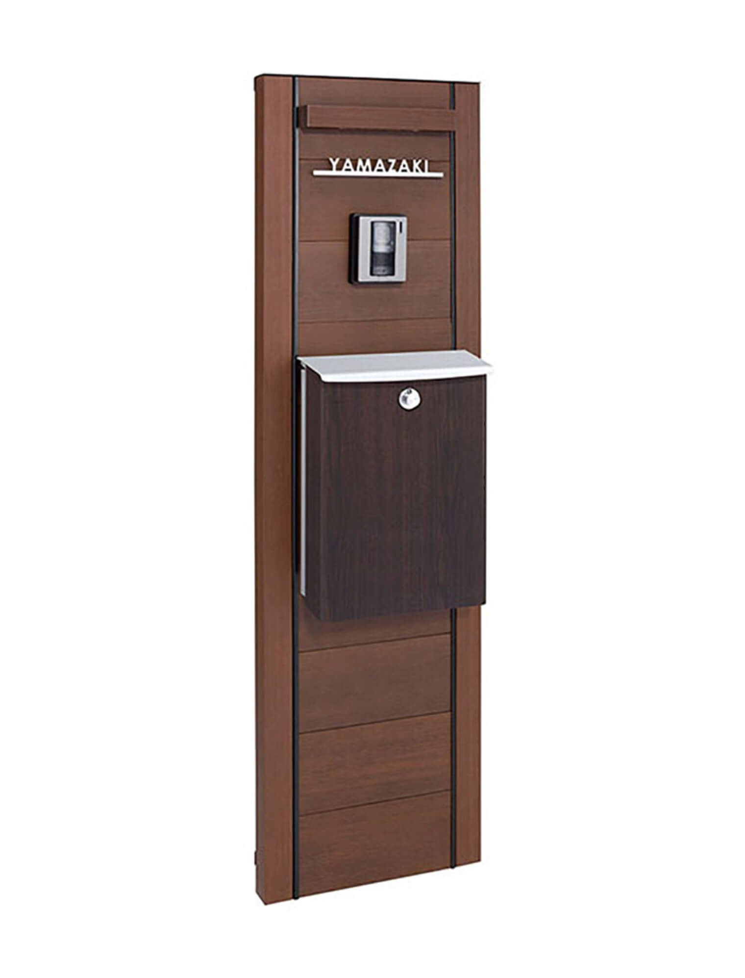 表札、インターホンカバー、ポスト、宅配ボックスの機能を一つに集約した機能門柱。すっきりとした本体フレームは2色から、表面の木調のデザインを4パターンから選べるので、ナチュラルな外構からスタイリッシュモダンや和風まで幅広い外構デザインにお使いいただけます。宅配ボックスは大型荷物も入る大容量タイプで、機能面にもこだわっています。